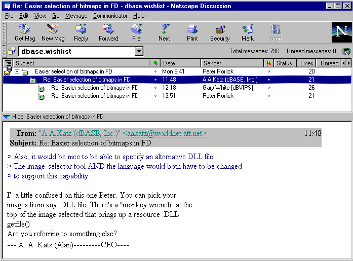 If you program with dBASE and you’ve never used the newsgroups, you’re missing out on something great. Just reading the messages in these groups (we call this lurking) on a regular basis is a fruitful and entertaining way to expand your knowledge base about dBASE and about programming in general. And if you get stuck or confused about a program that you’re working on, just start a new thread by posting a message that explains your problem. Chances are that your question will be answered — free of charge — on the same day, by some of the world’s best programming gurus. Sometimes you’ll get several answers in just a few minutes. The dBASE experts really seem to enjoy helping and educating others.